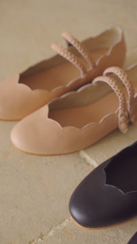 A modern nod to classic charm, these ballet flats feature delicate scalloped edges and braided straps for a stylish and polished look. Handcrafted from supple leather, they offer ultimate comfort for your busy days on the go.